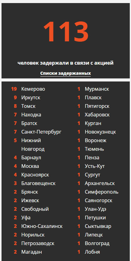 Найбільше затриманих в Кемерові - 19 осіб. Дев'ять осіб затримали в Іркутську, вісім в Томську, по сім - у місті Находка, Братськ і Санкт-Петербург. П'ять затриманих в Нижньому Новгороді, четверо в Барнаулі та Москві.