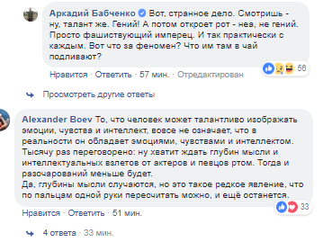 "Ось, дивна річ. Дивишся - ну, талант же. Геній! А потім відкриє рот - неа, не геній. Просто фашиствуючих імперец. І так практично з кожним. Ось що за феномен? Що їм там в чай підливають?", - пише Бабченко.