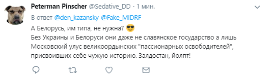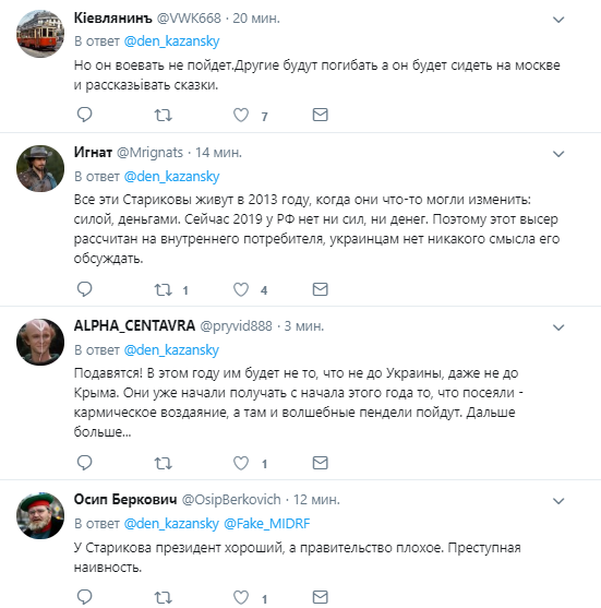 "Але він воювати не піде. Інші будуть гинути а він буде сидіти на москві і розповідати казки", "Всі ці Старікови живуть у 2013 році, коли вони щось могли змінити: силою, грошима. Зараз 2019 у РФ немає ні сил, ні грошей. Тому цей висер розрахований на внутрішнього споживача, українцям немає ніякого сенсу його обговорювати", "Подавляться! Цього року їм буде не те, що не до України, навіть не до Криму. Вони вже почали отримувати з початку цього року то, що посіяли - кармічне воздаяння, а там і чарівні пенделі почнуться. Далі більше...", "У Старікова Президет хороший, а уряд поганий. Злочинна наївність", "А Білорусь, їм типу, не потрібна? Без України і Білорусі вони навіть не слов'янська держава, а лише Московський улус велікоординскіх "пасіонарних визволителів", які привласнили собі чужу історію. Залдостан, йолпт!" - пишуть коментатори.