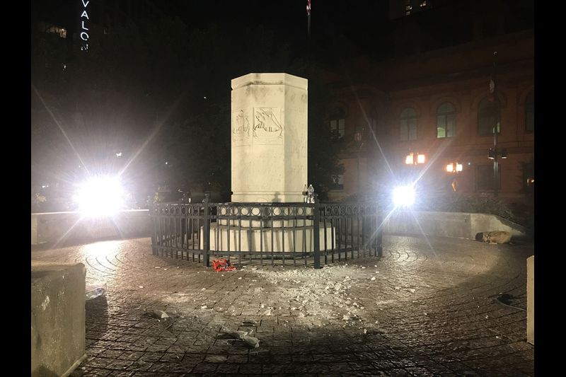 Протестувальники з криками на тлі феєрверка на честь Дня незалежності накинули мотузки на статую і скинули її з постаменту. Потім вони викотили її до берега і скинули в воду.