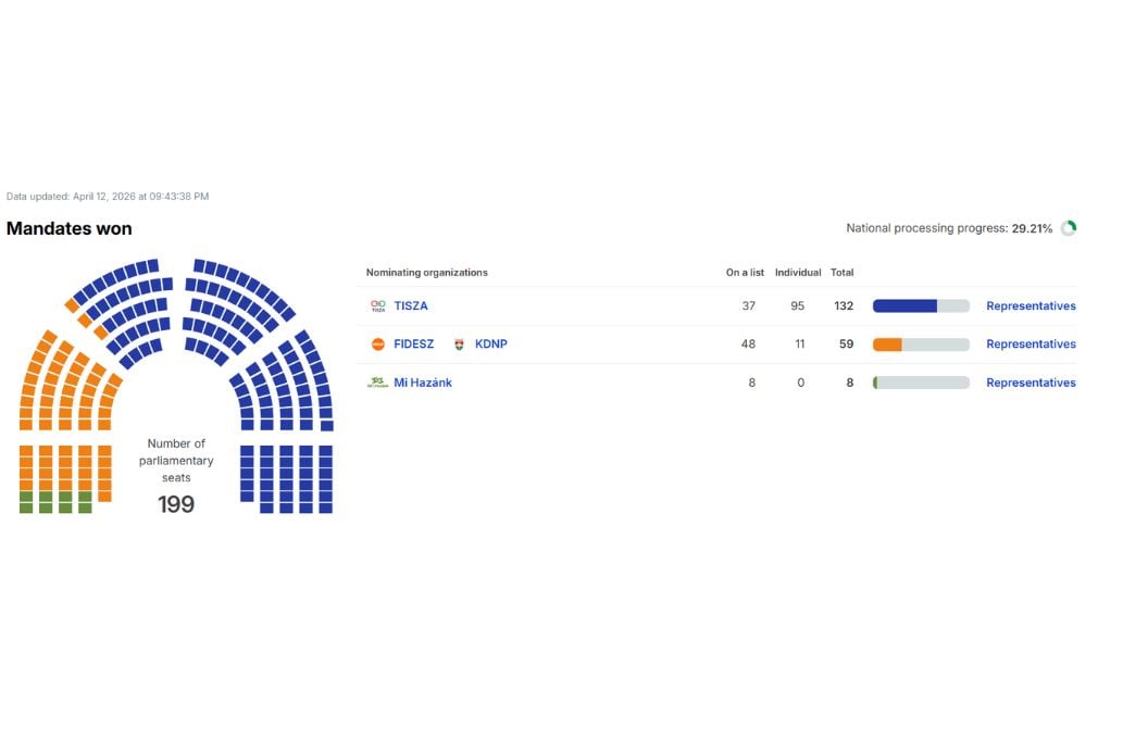 Оновлено о 22:04. Після підрахунку близько 45,71% голосів на парламентських виборах в Угорщині, за попередніми даними ЦВК, оприлюднені результати знову свідчать про лідерство опозиційної сили "Тиса".