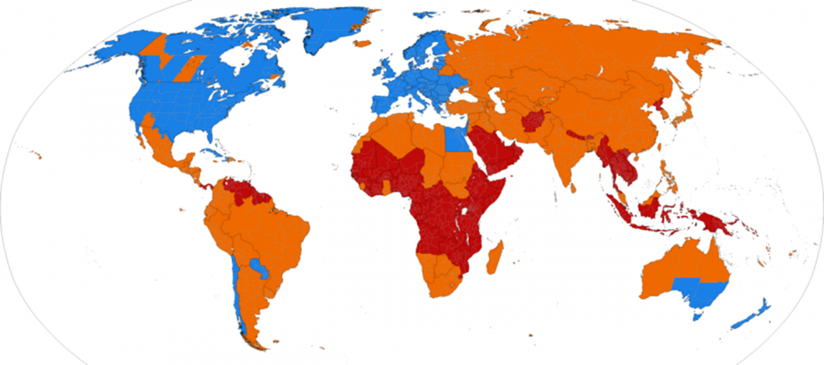 Синій колір - країни, які переходять на літній час, помаранчевий колір – відмовились від переходу на літній час, червоний колір – ніколи не переводили годинники