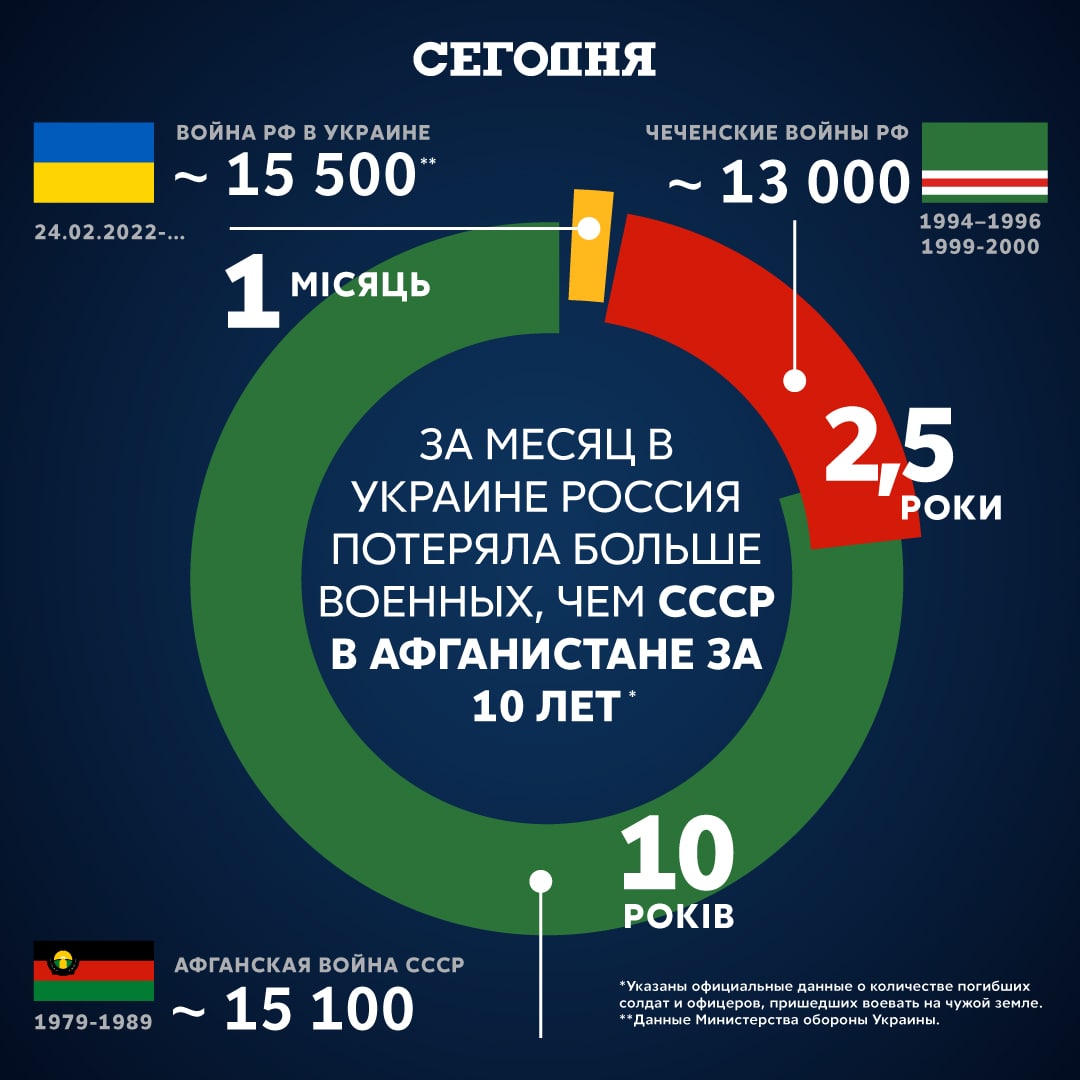 10:05 Російська армія за місяць війни в Україні втратила більше солдатів, ніж за 2,5 роки у Чечні, та за 10 років війни СРСР в Афганістані!