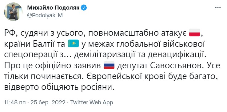 01:09. росія на Україні не зупиниться, а полізе далі на захід - написав радник ОП Михайло Подоляк.