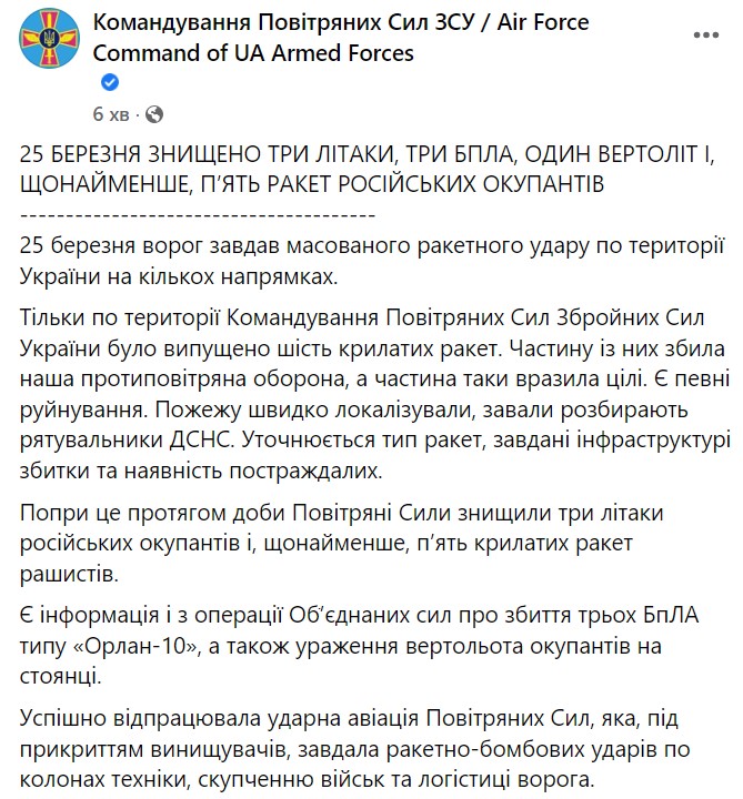 01:26. зведення Повітряних сил ЗСУ за 25 березня