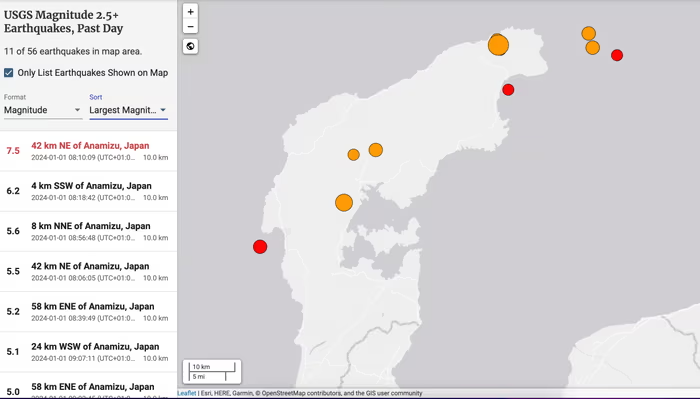 Землетрус стався на заході Японії. За даними Геологічної служби США (USGS), на глибині 10 кілометрів приблизно за 42 кілометри на північний схід від Анамідзу в префектурі Ісікава. За даними Геологічної служби США, за потужним землетрусом була серія сильних афтершоків магнітудою 6,2, 5,2 і 5,6 бала.