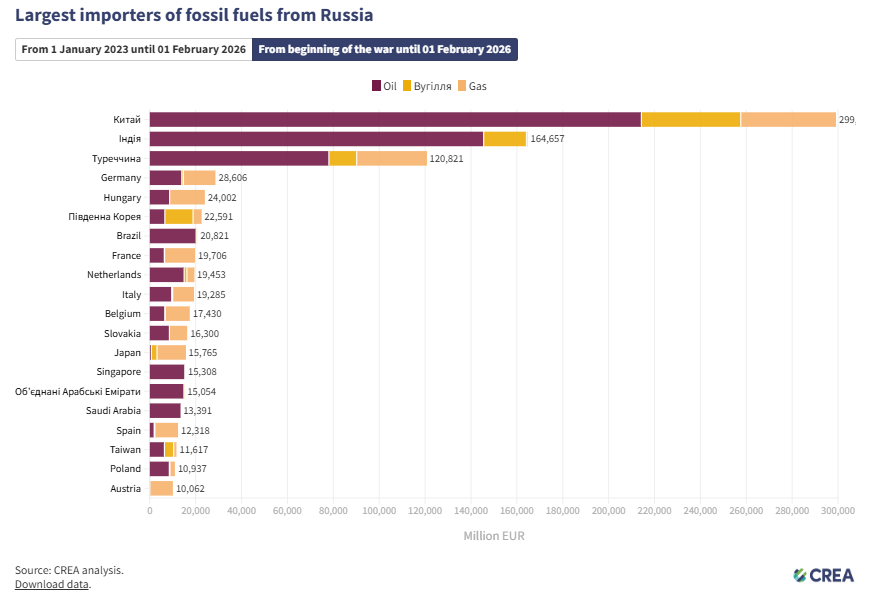 У списку найбільших імпортерів російських енергоресурсів лідирує Китай, який сплатив €299 млрд. Індія з початку повномасштабного вторгнення заплатила Росії €164 млрд, Туреччина — €120 млрд, Німеччина — понад €28 млрд, Південна Корея — понад €22 млрд та Бразилія — понад €20 млрд.