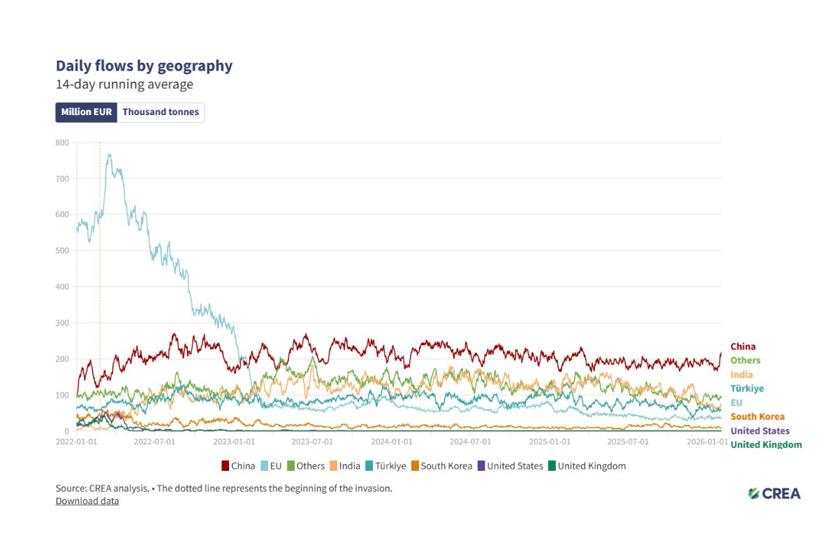 Загалом країни Європейського Союзу від 24 лютого 2022 року сплатили Росії понад €219 млрд, залишаючись одним із найбільших покупців енергоносіїв поряд із країнами Азії та Близького Сходу.