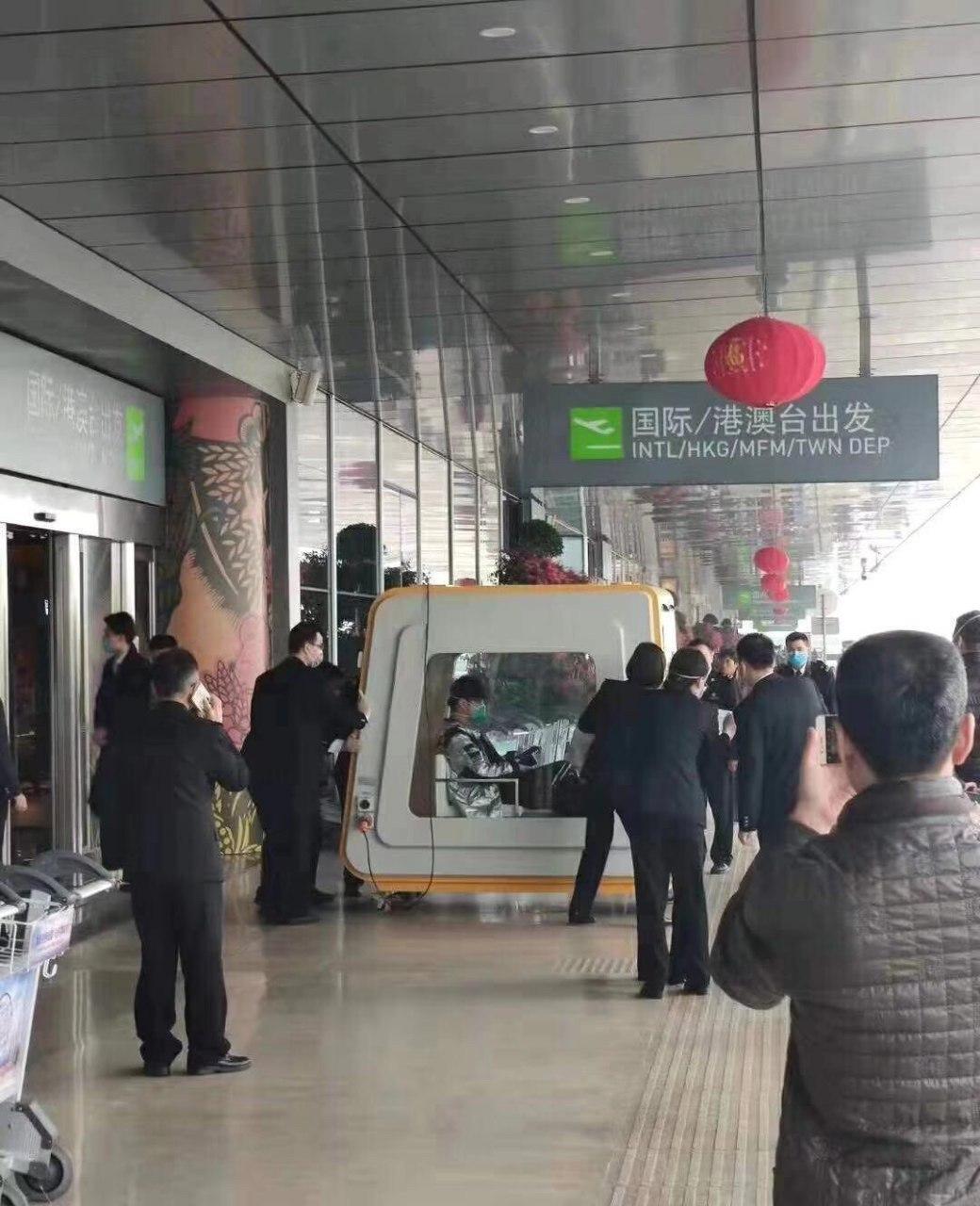 У мережі з'явилося також фото пасажира, у якого виявили симптоми коронавірусу. Його перевозять в карантинному боксі, на ньому - захисний костюм, маска і рукавички.