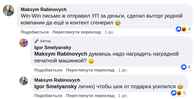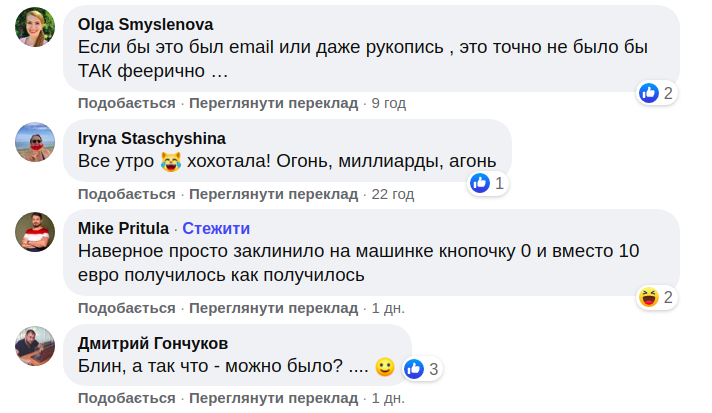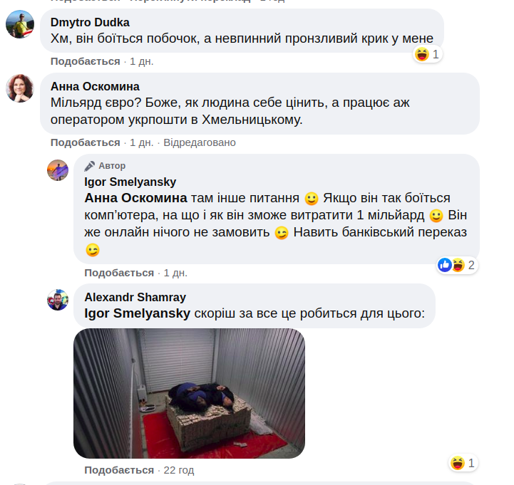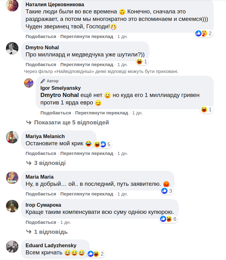 Користувачі соцмережі бурхливо відреагували на пост Смілянського. Особливо їм сподобалися сума і побічний ефект у вигляді "невпинного пронизливого крику".