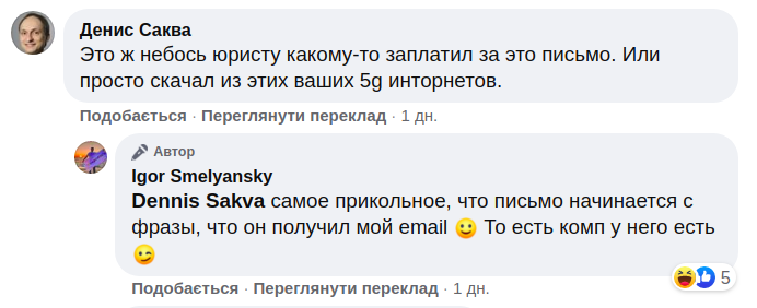 При цьому відправник послався на Закон України 1645-ІІІ "Про захист населення від інфекційних хвороб". У разі відмови від матеріального відшкодування у зазначеній сумі, автор листа пригрозив покарати топ-менеджера за примусову вакцинацію за ст. 365 Кримінального кодексу України.