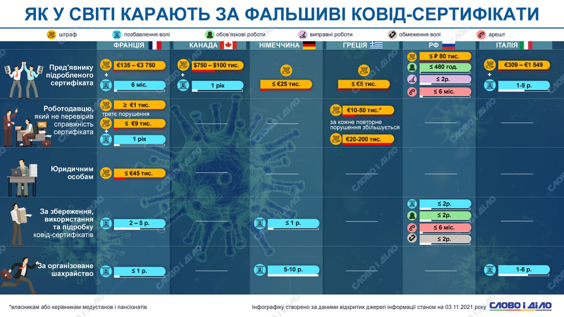 В Україні планують посилити покарання за підробку COVID-сертифікатів, а в деяких країнах світу за створення і використання фальшивих документів передбачені великі штрафи і навіть позбавлення волі.