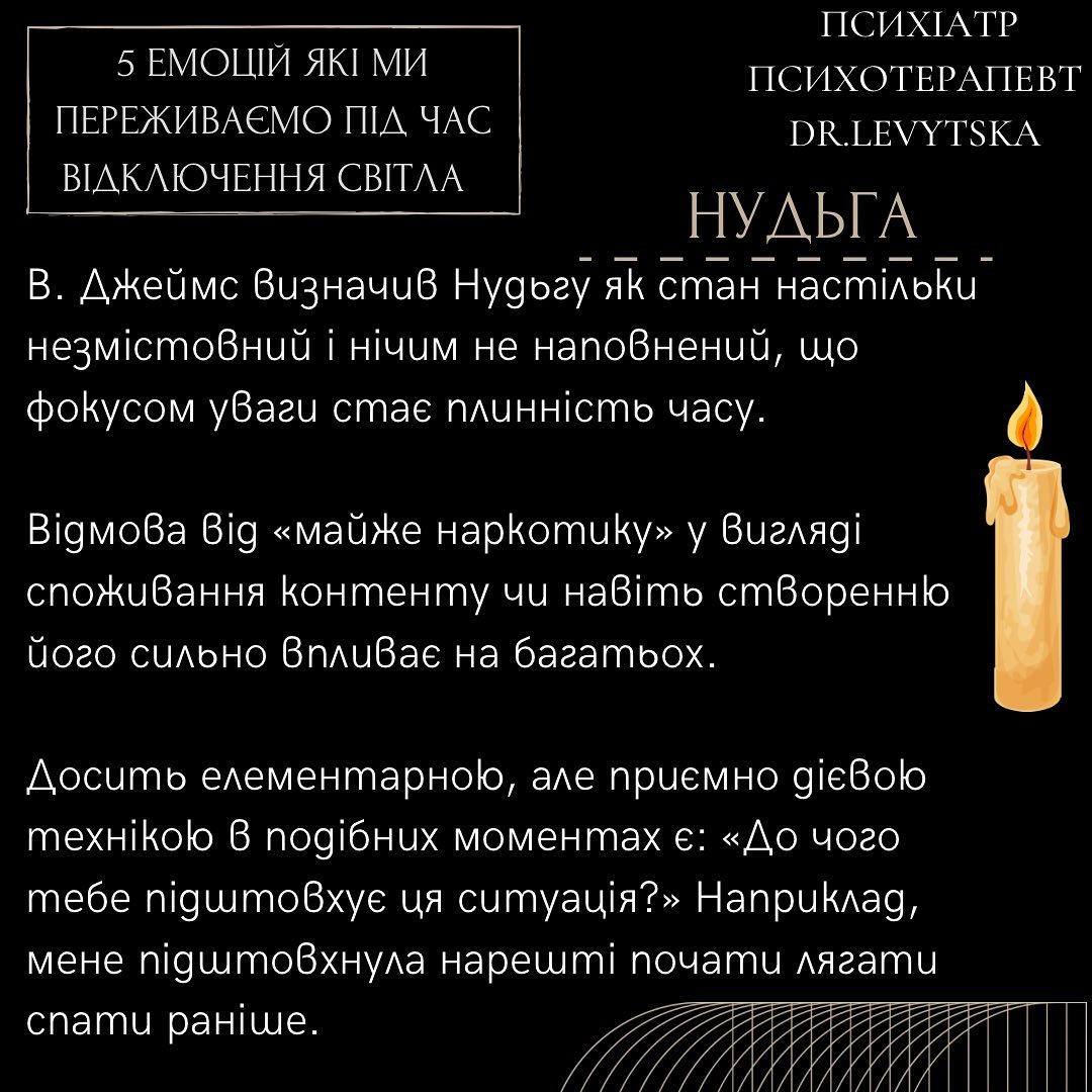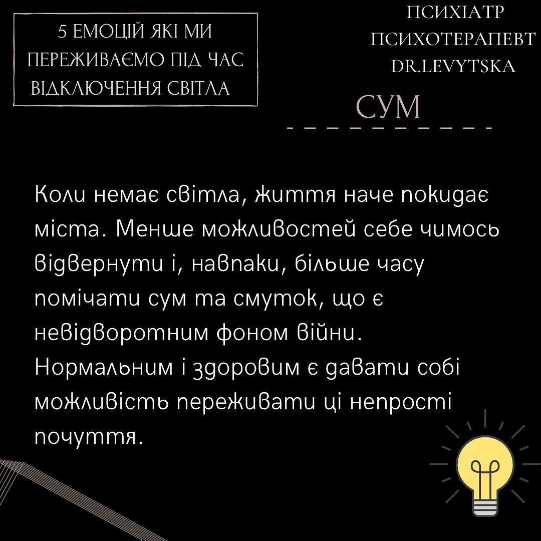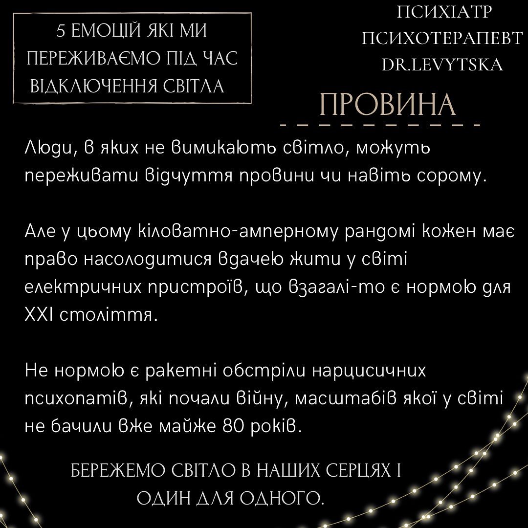 "Потреба у відключеннях електроенергії сьогодні є загальною для всієї країни. Кожному громадянину слід навчитися жити в нових реаліях. Абсолютно нормально трохи психувати та нервувати, якщо це не перетворюється у повсякденний стан, - продовжує пояснювати психіатр. - Щоб з комфортом переживати години відсутності електроенергії, намагайтеся завчасно готувати усе необхідне та спробуйте у проблемах шукати не загрозу, а можливість".