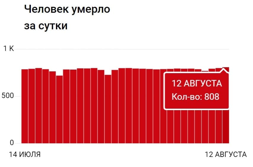 Так, з'явилася інформація, що в Росії, станом на 12 серпня, зареєстровано 21 932 нових випадків інфікування громадян вірусом COVID-19 в 85 регіонах країни. Також повідомляється, що за останню добу в Російській Федерації від ускладнень, викликаних коронавірусом, загинуло 808 осіб. Це є рекордом.