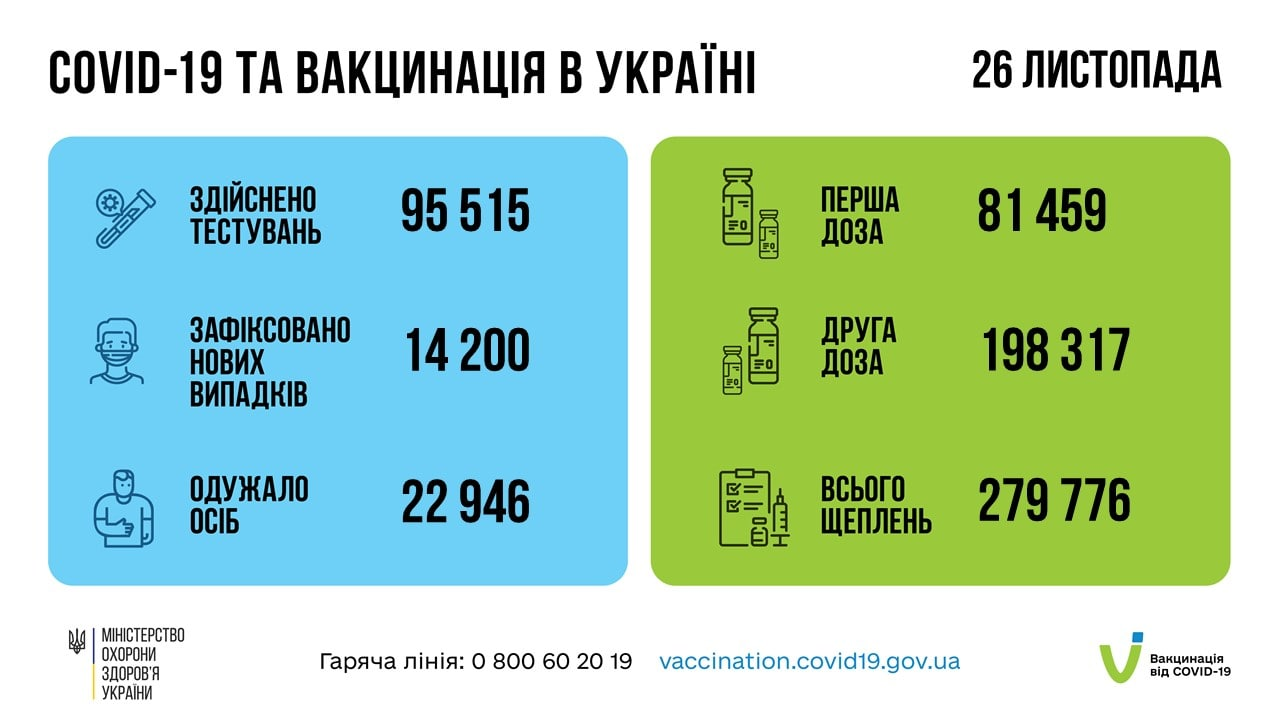 В Україні за минулу добу, 26 листопада, зафіксовано 14 200 нових підтверджених випадків коронавірусної хвороби COVID-19 (з них дітей – 1 296, медпрацівників – 212).